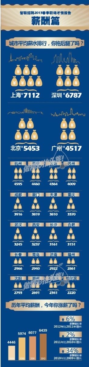 昨日,智联招聘发布的最新《2013春季职场才情报告》显示,根据对我国24个城市的薪资调查发现,上海白领以平均月薪7112元居首,其次为深圳,平均月薪为6787元,第三为北京,平均月薪为5453元。<strong>厦门白领月薪以3819元排在第十名。而从行业而言,能源、汽车、石油化工成为白领收入最高的三大行业。