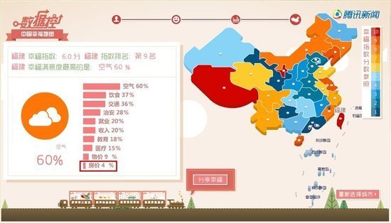 “中国幸福地图”充分利用腾讯网全平台问卷调查获取中国人的“幸福指数”,在这个平台上,你可就十大民生领域——“收入、治安、物价、饮食、交通、空气、房价、教育、医疗、就业”等投票,选出你觉得最幸福的领域,并发表一句话感言。