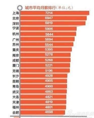 近日,2014年各城市平均薪酬排行榜出炉。数据显示,上海以月薪7214元高居全国薪酬排行榜榜首,超出第二位北京6947元约300元,深圳以月薪6819元位居第三位。厦门以月薪5221元位居排行榜第11位。