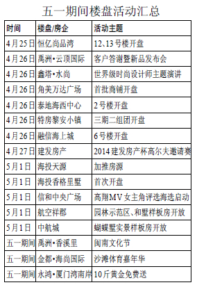 五一假期临近,笼罩观望氛围的厦门楼市迎来今年以来最大规模的楼盘促销潮。为抢夺传统黄金周市场份额和人气客流,不少开发商已经提前打响营销战。经历了短暂的沉寂期,五一成了开发商上半年必争的销售节点,但一些开发商为了避免扎堆竞争或为下一阶段的推盘预热,已在五一前提前发力。