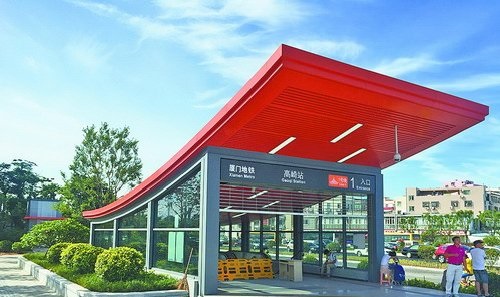 通透明亮的玻璃,轻盈的燕尾形状雨篷,搭配上闽南古厝的砖红色,既简洁大方,又体现了城市风貌和历史文化感,同时还具有空间辨识和定位的功能,这就是厦门地铁的出入口。除了美观,还兼具隔热、防晒、防飘雨、防淹的特点。