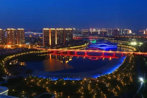 ▲厦门国际会展中心,高12米、长25米的“驶向未来”大型绿雕迎着晨光展现风采。