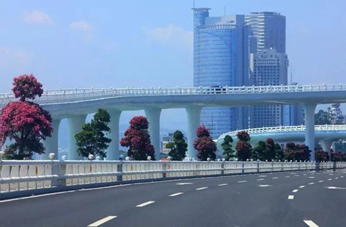 ▲演武大桥一带,沿路布满高度超过3.5米的紫花三角梅桩景。这些三角梅饱满成熟,枝叶全覆盖;造型优美,冠幅饱满。