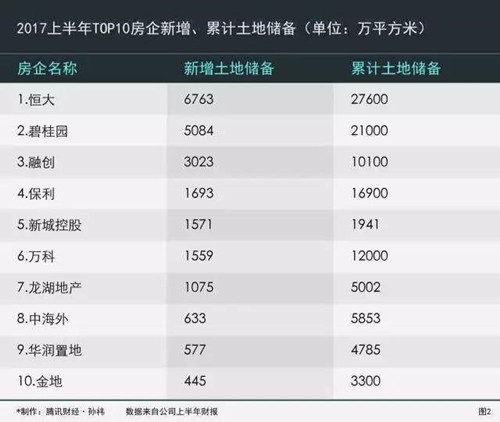 与万科的谨慎不同,腾讯财经梳理房企土地储备情况发现,恒大、碧桂园、融创对土地胃口更大,上半年三家新增土地分别为6763万平方米、5084万平方米、3023万平方米,累计土地储备分别为2.76亿平方米、2.1亿平方米及1.01亿平方米。
