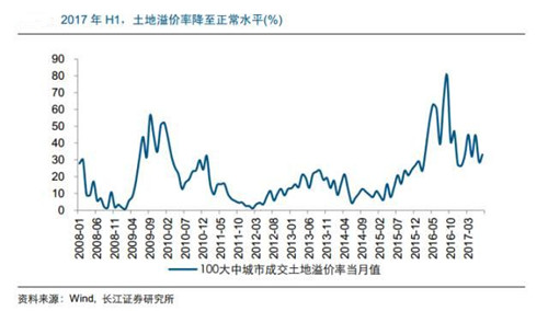 万科在财报中表示,今年第一、二季度的土地溢价率分别为 25.8%和 40.3%,相比去年同期已有较为明显的下降,部分三四线城市土地均价和成交溢价率有所上升。郁亮称“万科从来不主张囤积过多的土地储备,保证两到三年滚动开发的水平就够了,我认为买地需要讲时机。”