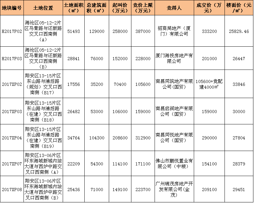 厦门采用“限地价、竞配建”的方式,公开出让海沧临港新城H2017P02、03地块和翔安新店镇2017XP02-04地块、翔安马巷镇2017XP07、08等7幅商住地块,总建筑面积52.28万平方米,最高总限价158.73亿元。本次土拍共吸引万科、建发、国贸、海投、招商等多家房企参拍,最终厦门今日土拍共吸金145.2亿元,仅翔安2017XP02、2017XP03两幅地块竞价上限,总配建面积4000平